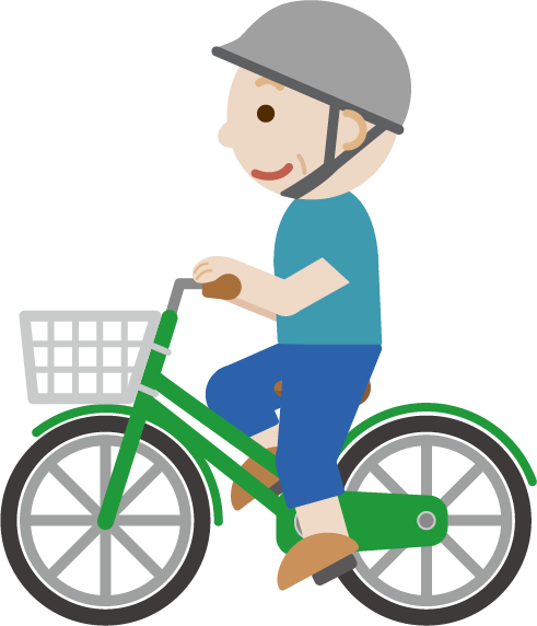 ヘルメットを被って、カゴ付きの緑色の自転車に乗って走る中年のおじさんのイラストです。自転車を漕ぐ。