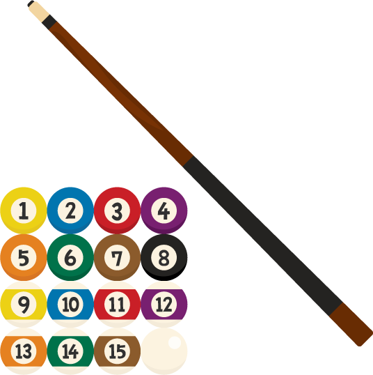 ビリヤードに使用するボールとキューのイラストです。全部セット。