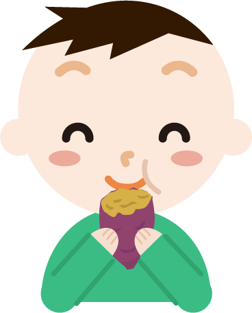焼きたてのやきいもを頬張る小学生の少年(子供)のイラストです。さつまいも。