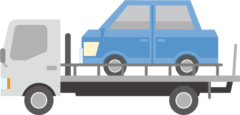 後ろに車を載せて運ぶ大型トラック、キャリアカー(車両運搬車)のイラストです。後ろに車を乗せている様子。