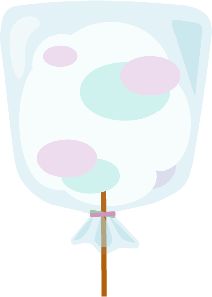 透明のビニール袋に入った、縁日で売られている白い綿あめ(わたあめ)、ワタアメ、綿菓子のイラストです。