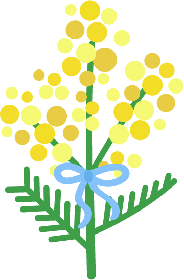 黄色くてふわふわした小さい花のミモザ花束のイラストです。リボン付き。