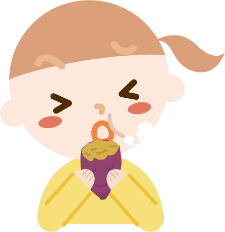 焼きたてのやきいもを頬張る小学生の少女(子供)のイラストです。熱そうにはふはふして食べている。さつまいも。