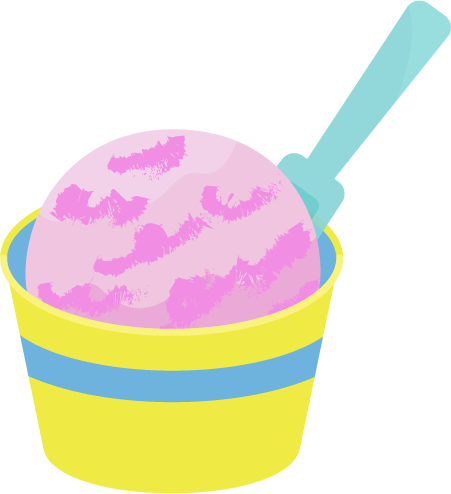 カップに入った、一段の苺(いちご)、ストロベリーアイスクリームのイラストです。マーブル模様。スクープしてくれるやつ。スプーンがついている。