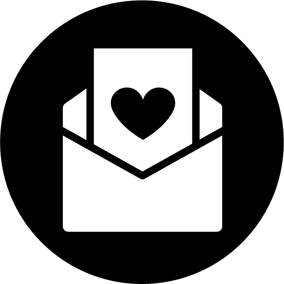 封筒から黒色のハートマーク付きの紙が見えている、ラブレターをイメージした丸いアイコンのイラストです。黒い丸背景つき。愛の手紙。白黒、モノクロ。