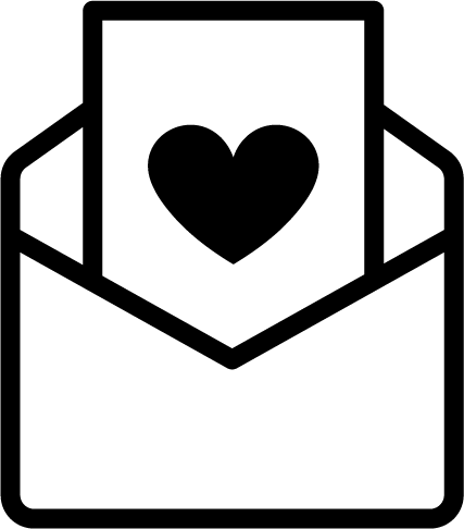封筒から黒色のハートマーク付きの紙が見えている、ラブレターをイメージした丸いイコンのイラストです。愛の手紙。白黒、モノクロ。