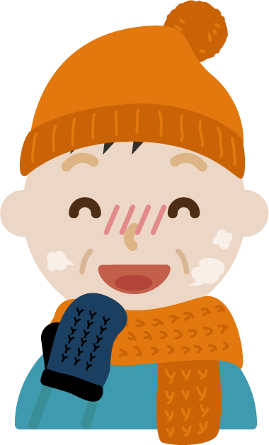ニット帽とマフラー、手袋を身に着て、寒さで顔を赤くした笑顔の中年のおじさんのバストアップのイラストです。白い息が出ている。冬の防寒。