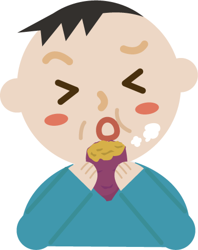 焼きたてのやきいもを頬張る中年のおじさんのイラストです。熱そうにはふはふして食べている。さつまいも。