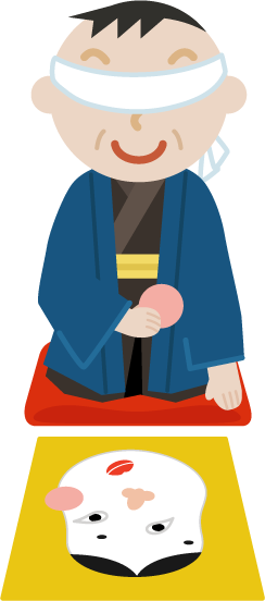 着物を着た中年のおじさんが、座布団に座って正座をして、目隠しをつけて福笑いのゲームをしているイラストです。