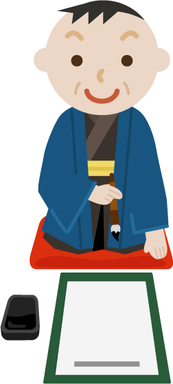 着物を着た中年のおじさんが、新年の書き初めをするイラストです。書道。