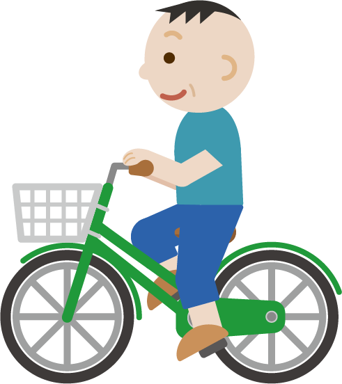 カゴ付きの緑色の自転車に乗って走る中年のおじさんのイラストです。自転車を漕ぐ。