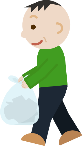ポリ袋に入ったゴミを持って歩く中年のおじさんのイラストです。ごみ出し。横向き。