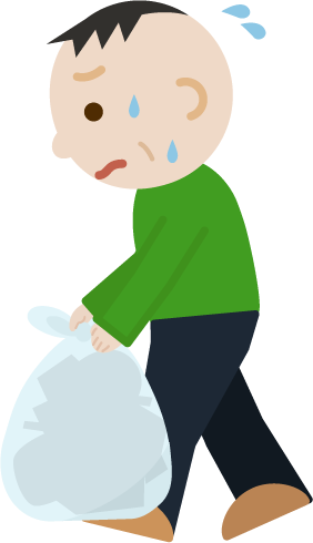重くて大変そうにポリ袋に入ったゴミを持って歩く中年のおじさんのイラストです。ごみ出し。横向き。