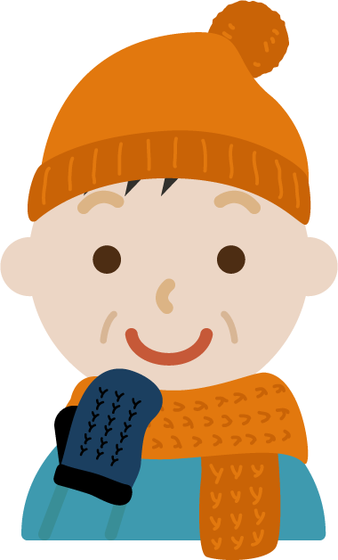 ニット帽とマフラー、手袋を身に着けた、中年のおじさんのバストアップのイラストです。冬の防寒。