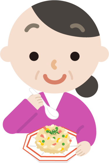 レンゲでチャーハンを食べようとしている中年のおばさんのイラストです。お米と野菜や肉を油で炒めた中華料理。