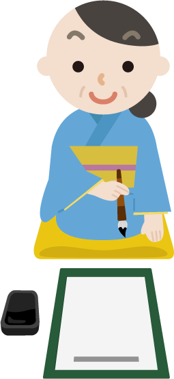 着物を着た中年のおばさんが、新年の書き初めをするイラストです。書道。