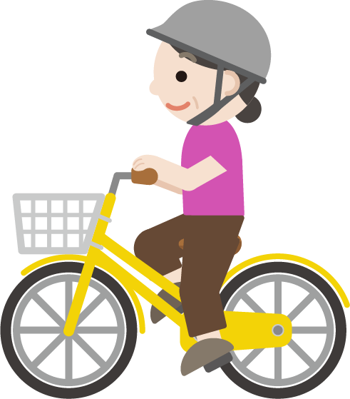 ヘルメットを被って、カゴ付きの黄色の自転車に乗って走る中年のおばさんのイラストです。自転車を漕ぐ。
