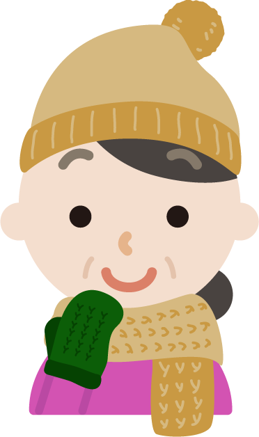 ニット帽とマフラー、手袋を身に着けた、中年のおばさんのバストアップのイラストです。冬の防寒。