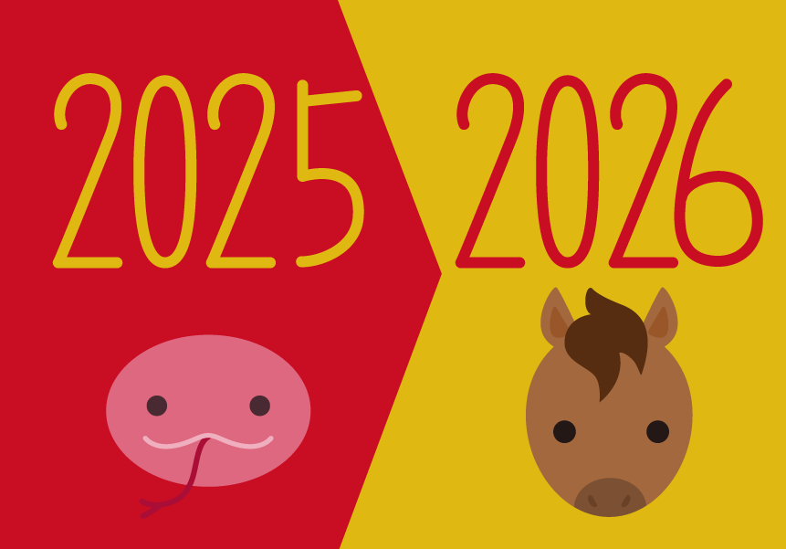 2025年から2026年へ、年を越すイメージのイラストです。巳年から午(馬)年へ。