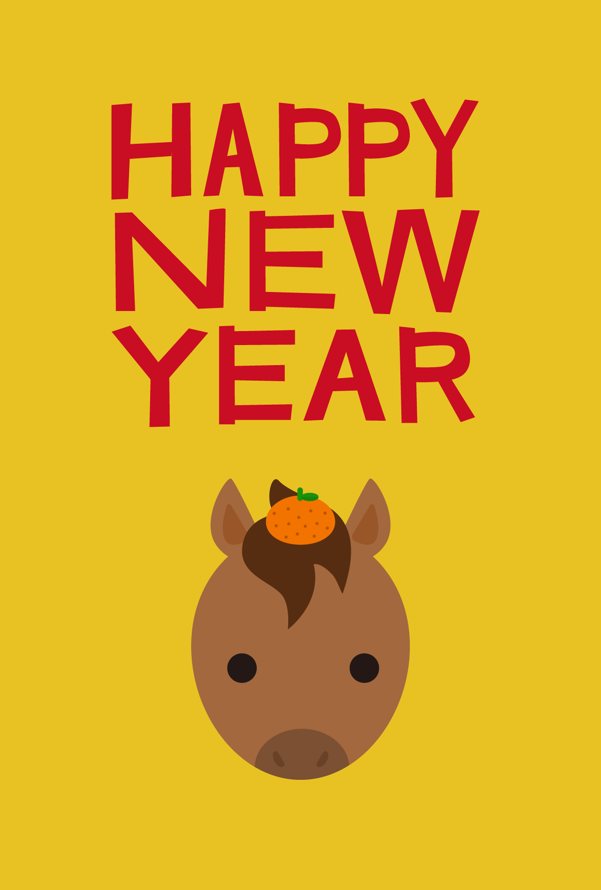 午年の年賀状のイラストです。「HAPPY NEW YEAR」と十二支の午(馬)、うまのイラストです。顔のアップ。頭の上にみかんが乗っている。