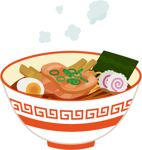 雷文(らいもん)の模様が入った赤い中華風の器に入った中華そば、ラーメンのイラストです。チャーシュー、なると、海苔(のり)、メンマ、煮卵、ネギがトッピングされ、湯気が出ている。