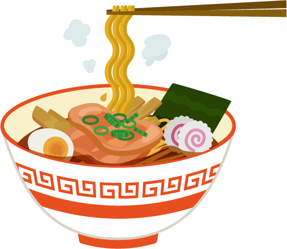 雷文(らいもん)の模様が入った赤い中華風の器に入った中華そば、ラーメンのイラストです。箸で麺を持ち上げている。チャーシュー、なると、海苔(のり)、メンマ、煮卵、ネギがトッピングされ、湯気が出ている。