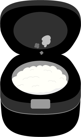 お米を炊く家電の炊飯器のイラストです。蓋が開いて炊きたてのご飯(白米)が湯気を立てている。黒色。