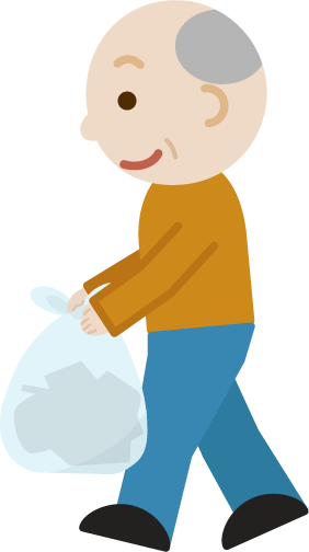 ポリ袋に入ったゴミを持って歩くおじいちゃん(老人)のイラストです。ごみ出し。横向き。