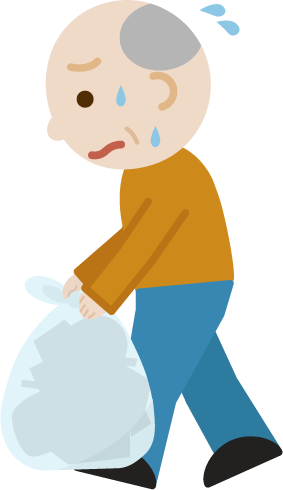 重くて大変そうにポリ袋に入ったゴミを持って歩くおじいちゃん(老人)のイラストです。ごみ出し。横向き。