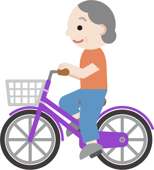 カゴ付きの紫色の自転車に乗って走るおばあちゃん(老人)のイラストです。自転車を漕ぐ。