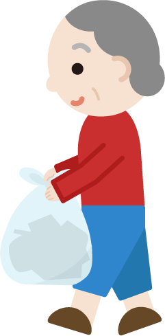 ポリ袋に入ったゴミを持って歩くおばあちゃん(老人)のイラストです。ごみ出し。横向き。