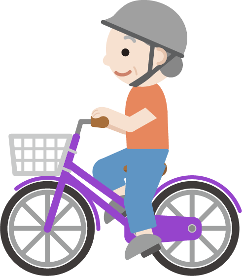 ヘルメットを被って、カゴ付きの紫色の自転車に乗って走るおばあちゃん(老人)のイラストです。自転車を漕ぐ。