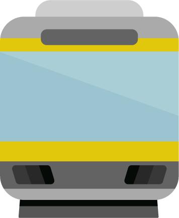 グレーのボディに黄色のラインが入った電車の正面向きのイラストです。