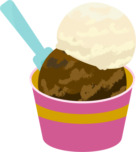 カップに入った、2段のアイスクリームのイラストです。チョコレートとバニラ。スクープしてくれるやつ。スプーンがついている。