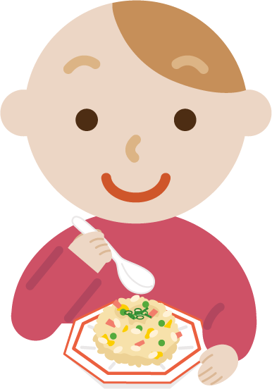 レンゲでチャーハンを食べようとしている若者の男の人のイラストです。お米と野菜や肉を油で炒めた中華料理。