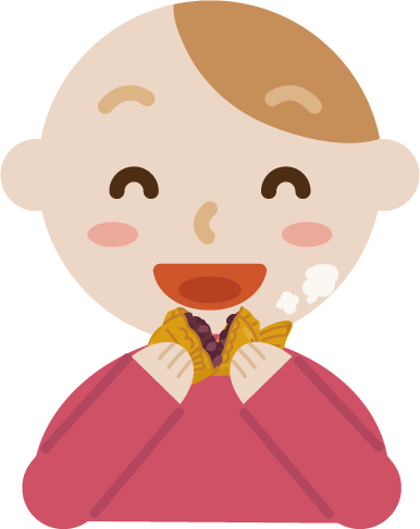 鯛の形をして、中にあんこが入っている和菓子の鯛焼き(たいやき)を食べる若者の男の人のイラストです。真ん中を割った状態。
