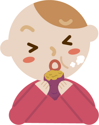 焼きたてのやきいもを頬張る若者の男の人のイラストです。熱そうにはふはふして食べている。さつまいも。