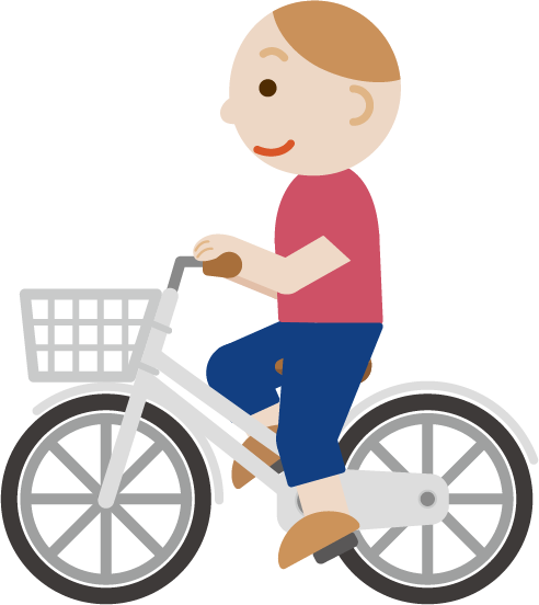 カゴ付きの白色の自転車に乗って走る若者の男の人のイラストです。自転車を漕ぐ。