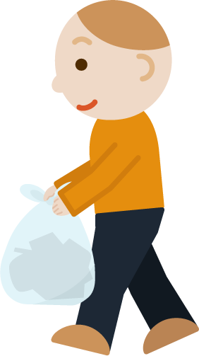 ポリ袋に入ったゴミを持って歩く若者の男の人のイラストです。ごみ出し。横向き。