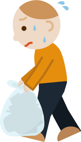 重くて大変そうにポリ袋に入ったゴミを持って歩く若者の男の人のイラストです。ごみ出し。横向き。