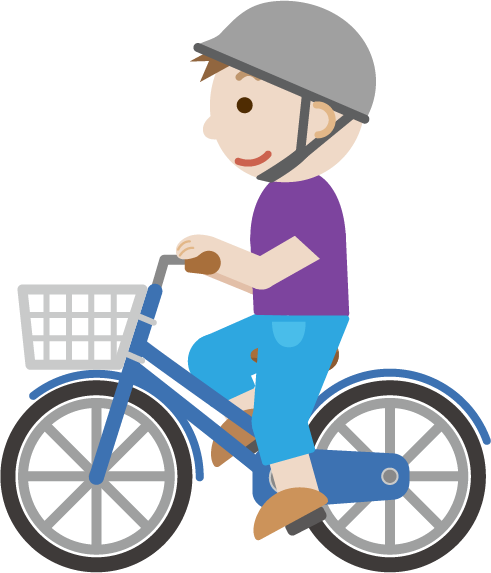 ヘルメットを被って、カゴ付きの青色の自転車に乗って走る若者の男の人のイラストです。自転車を漕ぐ。