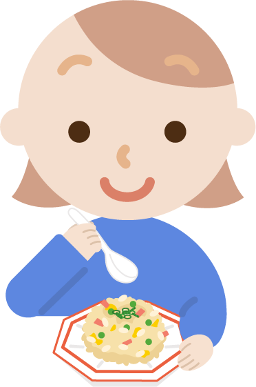 レンゲでチャーハンを食べようとしている若者の女の人のイラストです。お米と野菜や肉を油で炒めた中華料理。