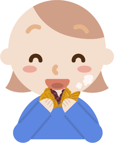 鯛の形をして、中にあんこが入っている和菓子の鯛焼き(たいやき)を食べる若者の女の人のイラストです。真ん中を割った状態。