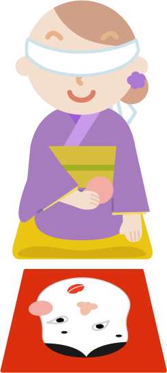着物を着た若者の女の人が、座布団に座って正座をして、目隠しをつけて福笑いのゲームをしているイラストです。