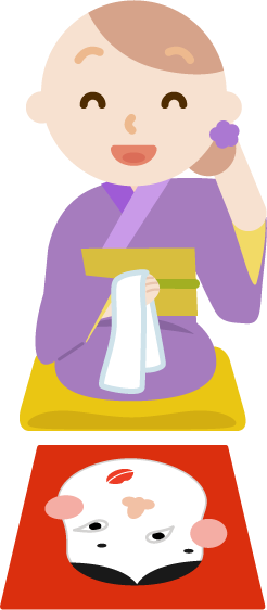 着物を着た若者の女の人が、座布団に座って正座をして、福笑いのゲームをしているイラストです。
