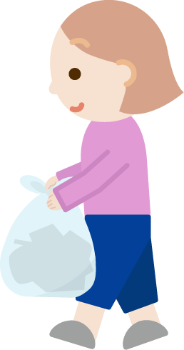 ポリ袋に入ったゴミを持って歩く若者の女の人のイラストです。ごみ出し。横向き。